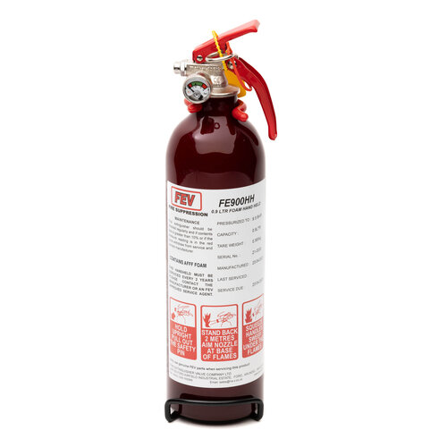 0.9ltr foam hand held fire extinguisher with wire bracket and 1 quick release strap, fitted with stainless steel nozzle. This hand held is designed for track day and personal use.